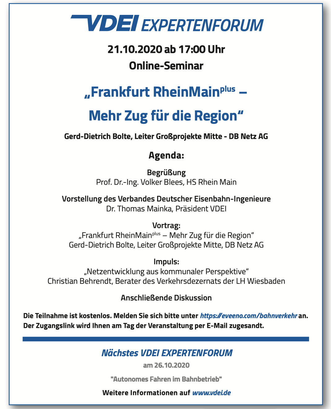 Am 21.10.2020 veranstaltet der VDEI in Kooperation mit der Hochschule RheinMain ein kostenfreies Online VDEI Expertenforum zum Thema "Frankfurt RheinMain plus - Mehr Zug für die Region". Referent ist Herr Gerd-Dietrich Bolte, Leiter Großprojekte Mitte von der DB Netz AG.