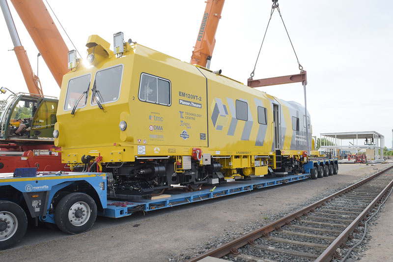 Messeaufbau der iaf 2022. Kranung einer Stopfmaschine.
